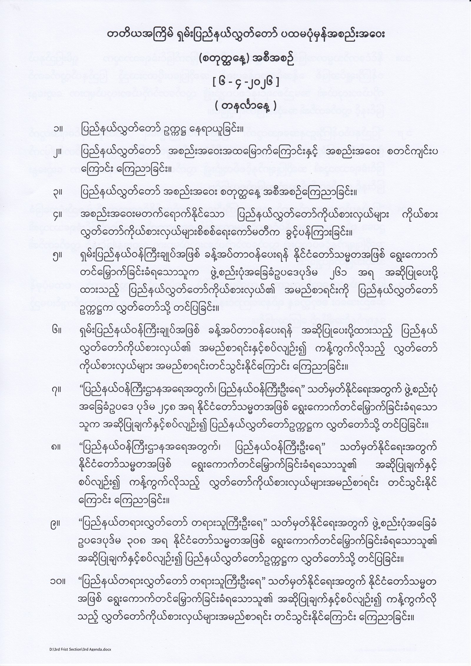 - တတိယအကြိမ် ရှမ်းပြည်နယ်လွှတ်တော် ပထမပုံမှန်အစည်းအဝေး (တတိယနေ့) အစီအစဉ်