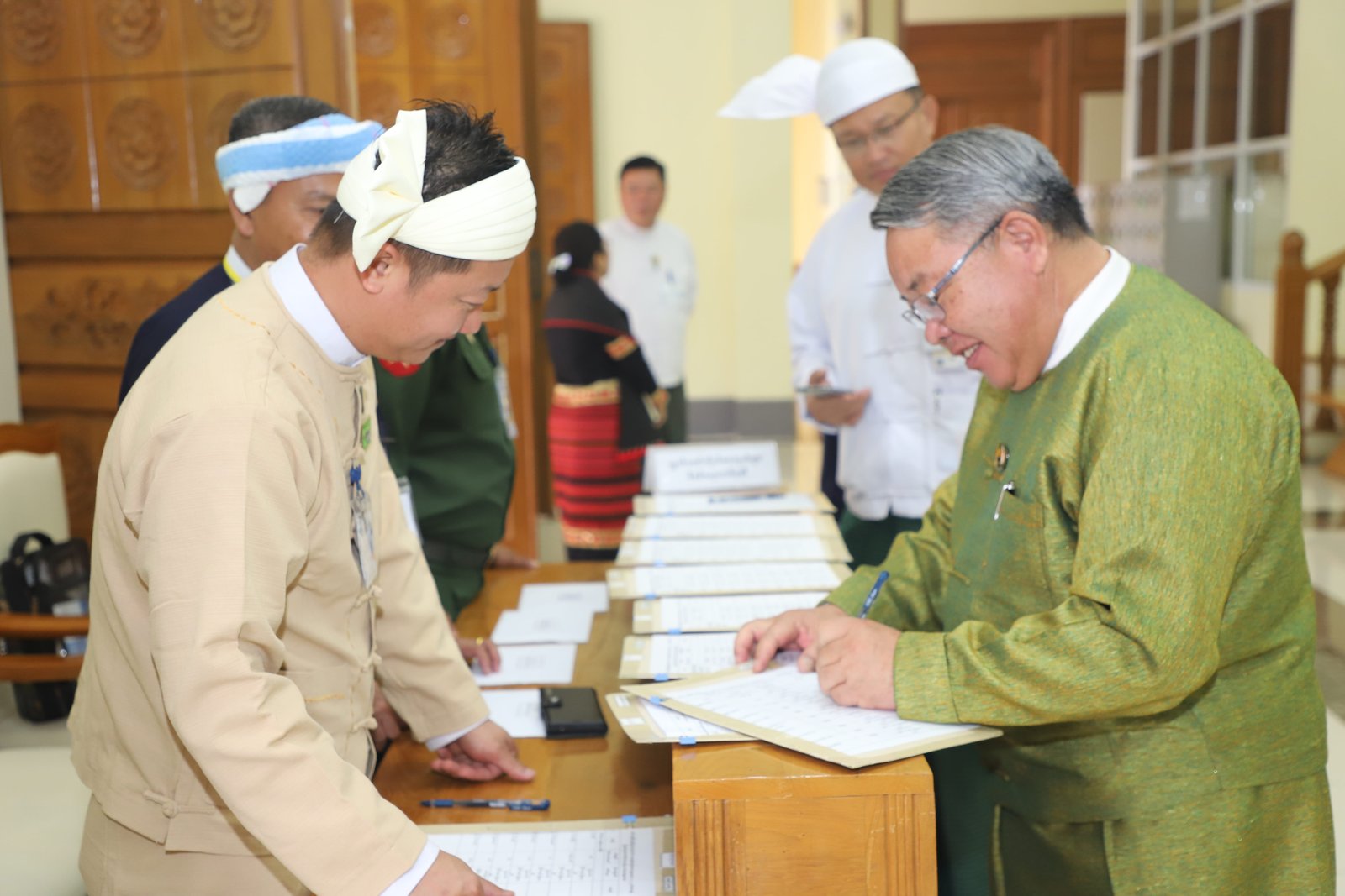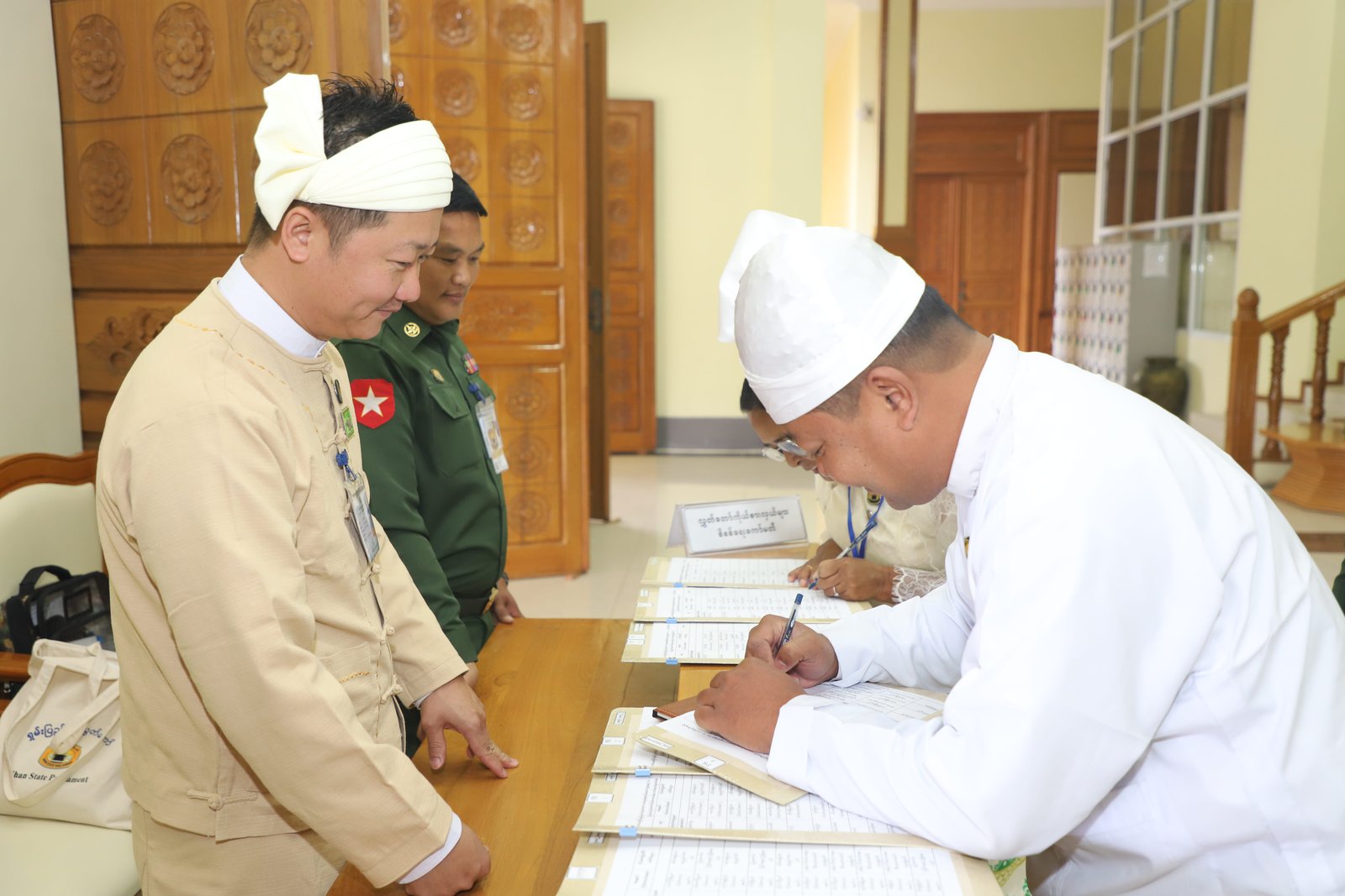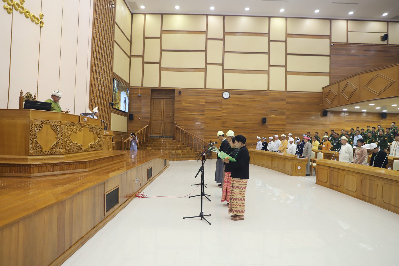 ၎င်းနောက် ပြည်နယ်ဥပဒေချုပ်အဖြစ် ခန့်အပ်တာဝန်ပေးအပ်ပြီးဖြစ်သော ဦးစိုင်းကျော်ဇံက ပြည်နယ်လွှတ်တော်ဥက္ကဋ္ဌ ရှေ့မှောက်၌ ကတိသစ္စာပြုခဲ့ပြီး ကတိသစ္စာပြုလွှာပေါ်တွင် လက်မှတ်ရေးထိုးခဲ့ပြီးနောက် ပြည်နယ်စာရင်းစစ်ချုပ်အဖြစ် ခန့်အပ်တာဝန်ပေးအပ်ပြီးဖြစ်သော ဒေါ်ခင်ထွေးရီက ပြည်နယ်လွှတ်တော်ဥက္ကဋ္ဌ ရှေ့မှောက်၌ ကတိသစ္စာပြုခဲ့ပြီး ကတိသစ္စာပြုလွှာပေါ်တွင် လက်မှတ်ရေးထိုး ခဲ့သည်။