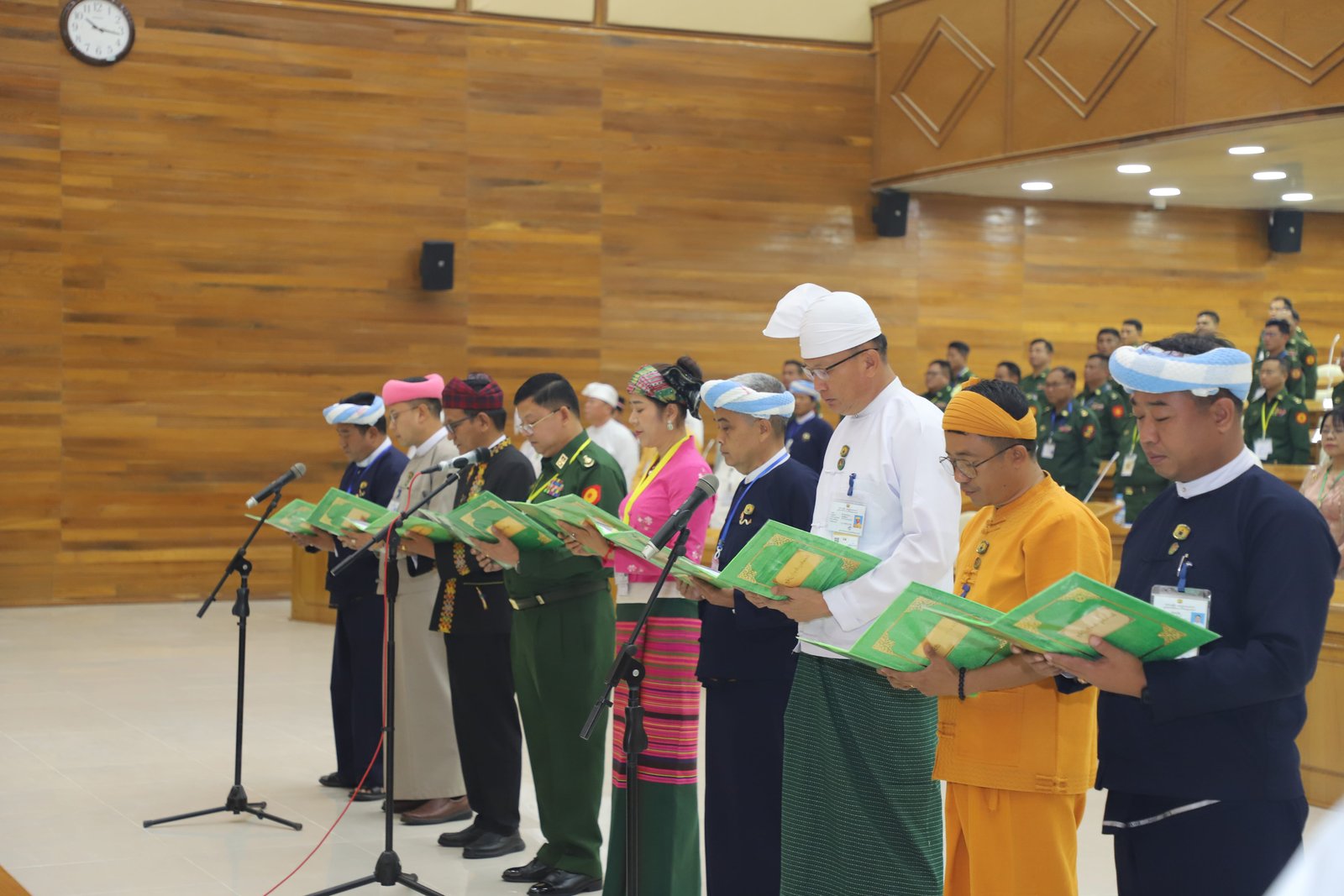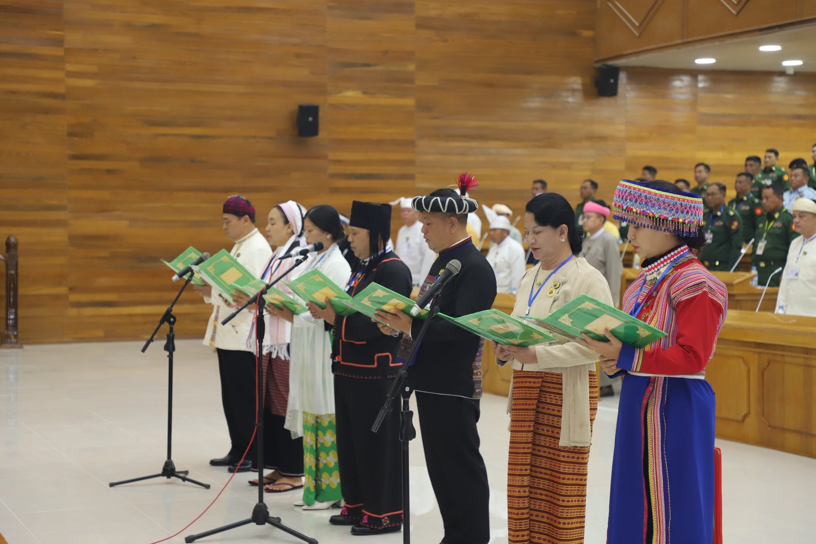 ဆက်လက်ပြီး ပြည်နယ်တရားလွှတ်တော်တရားသူကြီးချုပ် ဦးသန်းဦးလွင်နှင့် ပြည်နယ်တရား လွှတ်တော်တရားသူကြီးများအဖြစ် ခန့်အပ်တာဝန်ပေးအပ်ပြီးဖြစ်သောပုဂ္ဂိုလ်များ၊ ရှမ်းပြည်နယ်အစိုးရ အဖွဲ့ ပြည်နယ်ဝန်ကြီးများနှင့် ကိုယ်ပိုင်အုပ်ချုပ်ခွင့်ရဒေသဦးစီးအဖွဲ့ဥက္ကဋ္ဌများအဖြစ် ခန့်အပ်တာဝန် ပေးအပ်ပြီးဖြစ်သော ပုဂ္ဂိုလ်များ၊ ပြည်နယ်တိုင်းရင်းသားလူမျိုးရေးရာဝန်ကြီးများအဖြစ် ခန့်အပ်တာဝန်ပေးအပ်ပြီးဖြစ်သော ပုဂ္ဂိုလ်များက ပြည်နယ်လွှတ်တော်ဥက္ကဋ္ဌ ရှေ့မှောက်၌ ကတိသစ္စာပြုခဲ့ပြီး ကတိသစ္စာပြုလွှာပေါ်တွင် လက်မှတ်ရေးထိုးခဲ့ကြသည်။