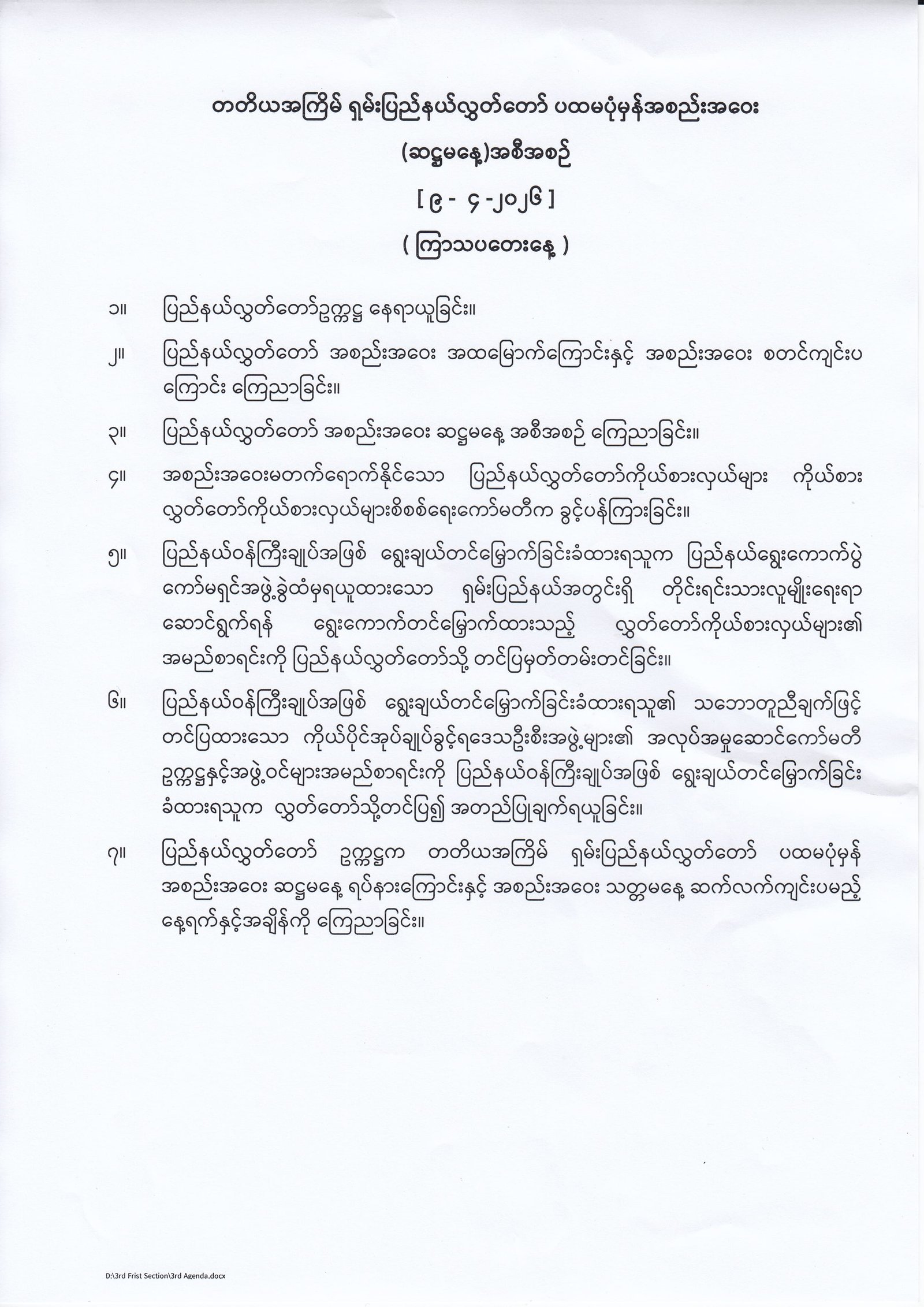 တတိယအကြိမ်ရှမ်းပြည်နယ်လွှတ်တော်ပထမပုံမှန်အစည်းအဝေး(သတ္တမနေ့)အစီအစဉ်(မူကြမ်း)