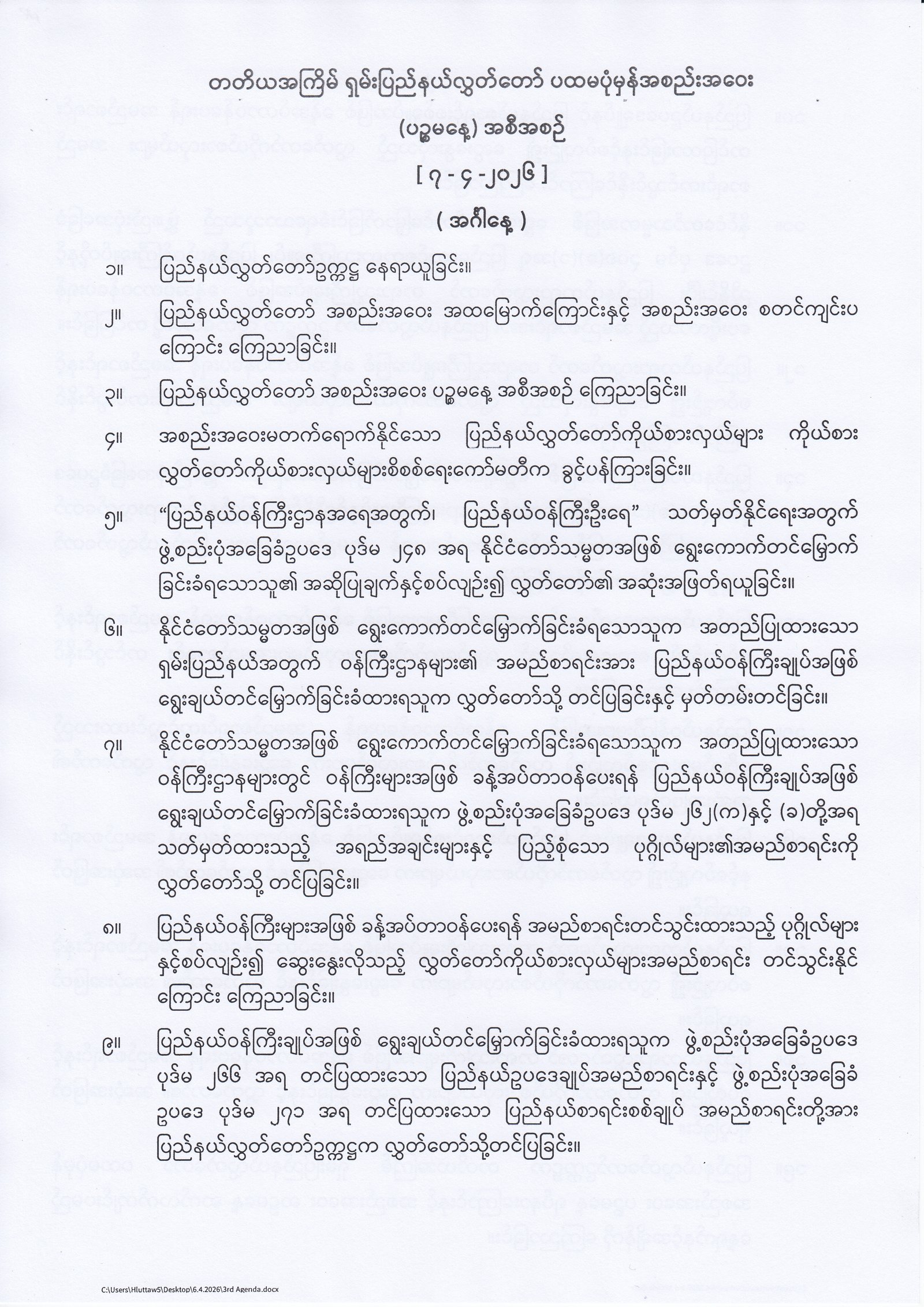 တတိယအကြိမ်ရှမ်းပြည်နယ်လွှတ်တော်ပထမပုံမှန်အစည်းအဝေး(ပဉ္စမနေ့)အစီအစဉ်