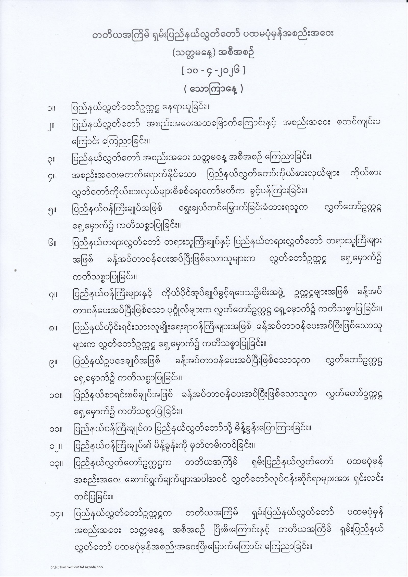 တတိယအကြိမ်ရှမ်းပြည်နယ်လွှတ်တော်ပထမပုံမှန်အစည်းအဝေး(သတ္တမနေ့)အစီအစဉ်(မူကြမ်း)